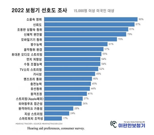 미국내에서 처방전 없이 구입할 수 있는 보청기의 반대자들은 청각 인지 및 신경 가소성 변화로 인해 공급자의 인식된 부정적인 건강 결과로 이어지는 자기 선택의 불일치 또는 과소 증폭에 대해 폭넓게 우려를 표명합니다. 널리 퍼진 믿음과는 달리, 이 문제는 보청기에 새로운 것이 아니며 확실히 OTC 이후 환경에서 새로운 것이 아닙니다. 수년 동안 사람들이 (모든 유형의) 보청기를 찾는 주된 이유는 그들이 불만족스러워하는 주된 이유이기도 합니다. 2022년 보청기 선호도를 문서화한 최근 항목을 통해 여러 설문조사에서 이 사실을 확인할 수 있습니다(아래 그림 참조).