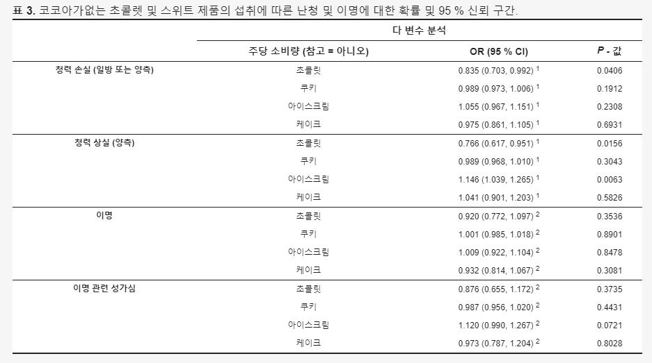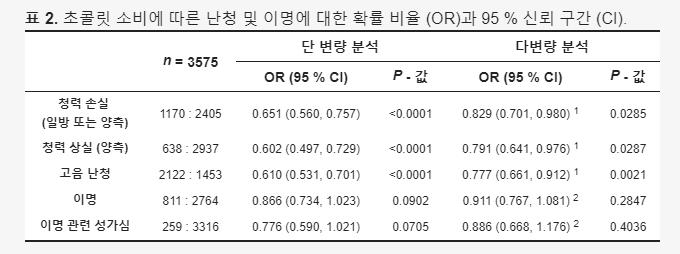 결과적으로 초콜릿을 섭취 한 대상자의 26.78% (338/1,262)가 그렇지 않은 사람들 35.97% (832/2,313)보다 난청 발생률 (일측성 또는 양측성난청)이 유의하게 낮은 결과를 얻을 수 있었다. 연구팀은 초콜릿 소비에 따른 난청 및 이명에 대한 확률 비율 (95%신뢰구간- 표2)를 조사하였고, 코코아가 없는 달콤한 제품의 섭취와의 연관성도 조사하였으나 청력손실의 감소와 유의한 관련이 없는 것으로 나타났습니다(표3).