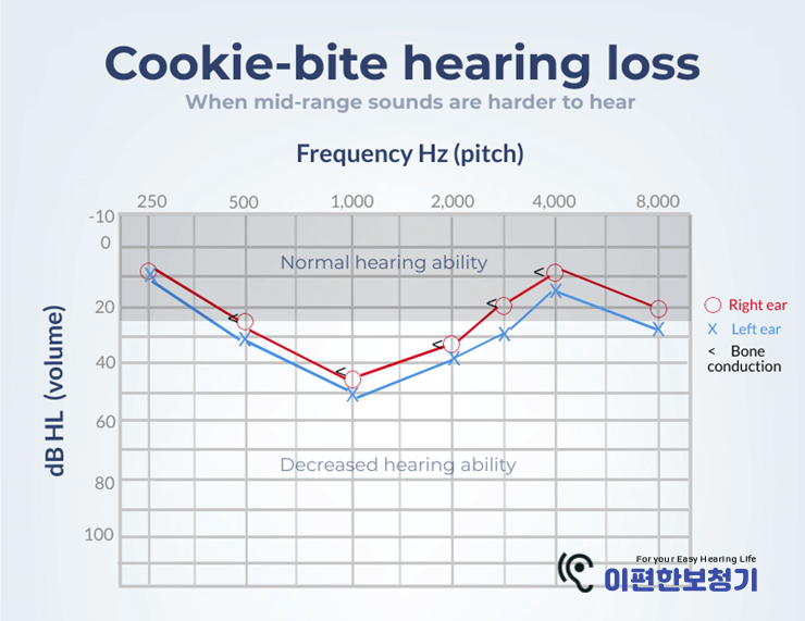 그리고 이 청력도는 중간 음조가 듣기 더 어려운 "쿠키 바이트" 난청을 나타냅니다.