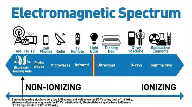 블루투스 보청기는 안전합니다. 그들은 매우 낮은 수준의 비이온화 방사선을 사용합니다. 이는 휴대폰이나 Wi-Fi 네트워크보다 훨씬 적습니다. FDA와 FCC는 모두 건강을 보호하기 위해 이러한 장치를 주의 깊게 모니터링합니다. 공중 보건 데이터는 블루투스 보청기에서 RF 에너지에 노출되는 것과 건강 문제 사이에 아무런 연관성을 제시하지 않습니다. 그것들이 건강에 위험을 초래한다는 신뢰할 만한 과학적 증거는 없습니다.
