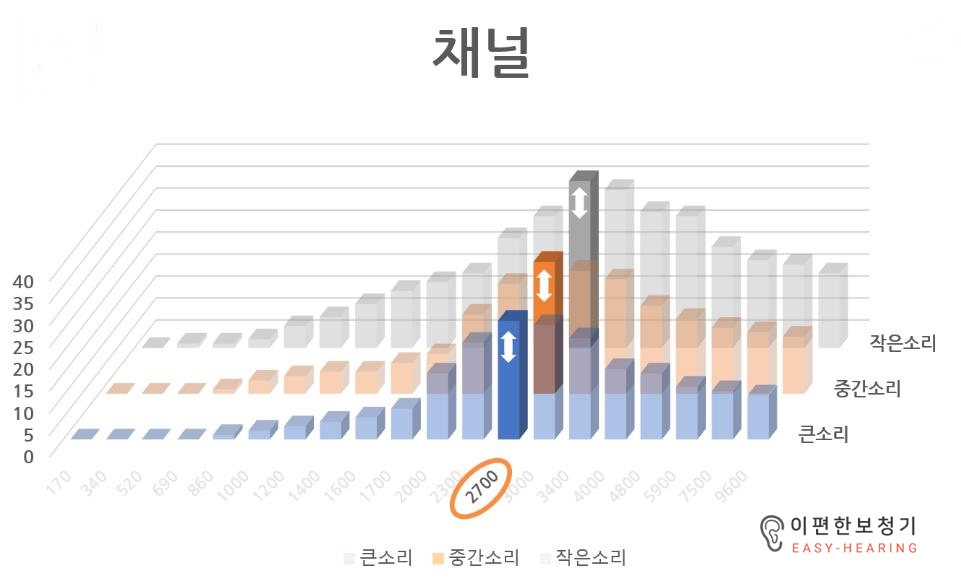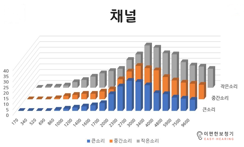 채널저주파수에서 고주파수까지 보청기로 입력되는 모든 영역의 소리를 강도별(큰소리-보통소리-작은소리)로 조절하는것입니다. 이 채널의 역할은 주파수별로 소리의 영역을 세분화하여 강도별로 압축비를 달리하여 각각 조절하는 것입니다. 즉, 큰소리-중간소리-작은소리에 대한 증폭량을 다르게 할 수 있다는 의미입니다.