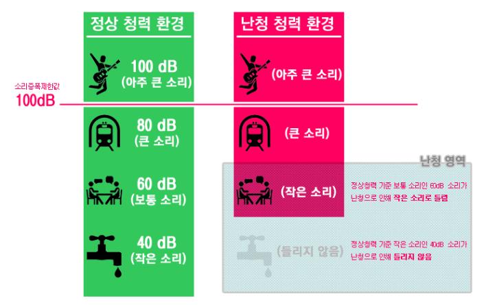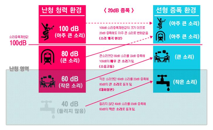 소리의 왜곡현상을 쉽게 설명하기 위해, 우선 소리의 증폭 제한값을 100dB라고 가정해 보면, 난청으로 인해 40dB 강도의 소리는 듣지 못하고, 60dB 강도의 소리는 작게, 80dB 강도의 소리는 크게, 100dB 소리는 매우 크게 듣는 사람이 있습니다.(하단 그림참조)