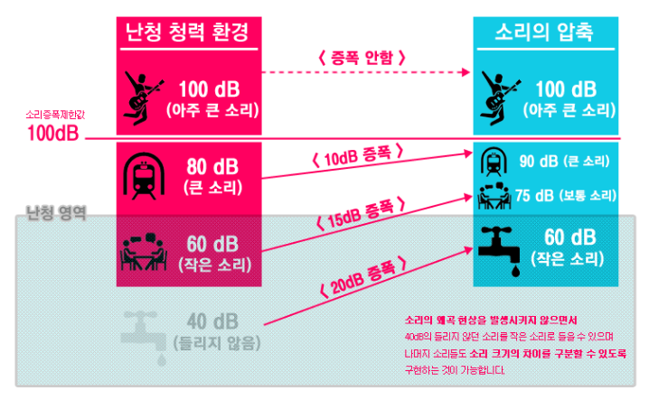 즉, 선형 방식에서는 90dB와 100dB 소리를 구분하지 못하고 매우 큰 소리로 듣게되는 소리의 왜곡현상을 겪었지만. 비선형 방식을 통해 40dB 강도의 소리는 60dB로, 60dB 강도의 소리는 75dB로, 80dB 강도의 소리는 90dB로, 100dB 소리는 100dB 그대로 되는 방식으로 입력값 대비 출력값의 증가비율을 줄여 적용하여, 증폭 이후에도 소리 왜곡현상 없이 모든 소리를 구분하여 또한 듣는 것이 가능하게 됩니다.(하단, 그림참조)