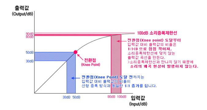 전환점(Knee Point)이후 입력값 대비 출력값 비율이 1:1 증가에서 1:1<0 로 증가율이 줄어들면서 소리증폭제한선과 출력값이 만나지 않아 소리의 왜곡현상이 발생하지 않는다.