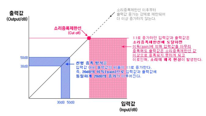 입력값과 출력값이 1:1로 증폭하는 선형 방식의 경우 필연적으로 소리의 증폭값(dB)은 증폭 제한선에 도달하게 되므로 소리의 왜곡현상을 피할 수 없습니다.