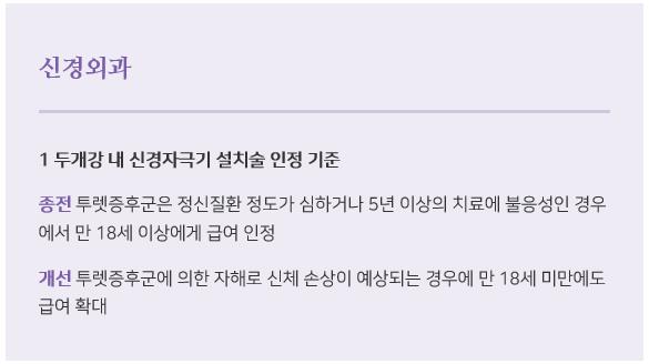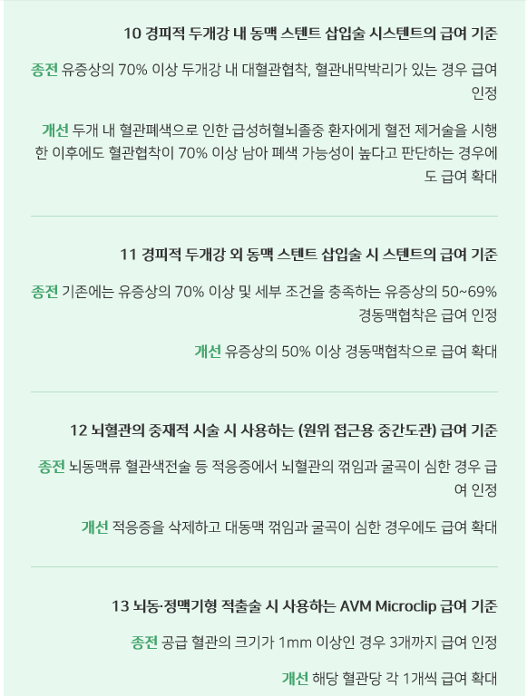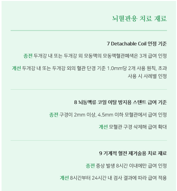-  뇌경색(급성 허열뇌졸중)에서 혈전제거술 8시간 인정(기존) → 증상 발생 24시간 이내의 환자중 검사결과에 따라 급여적용