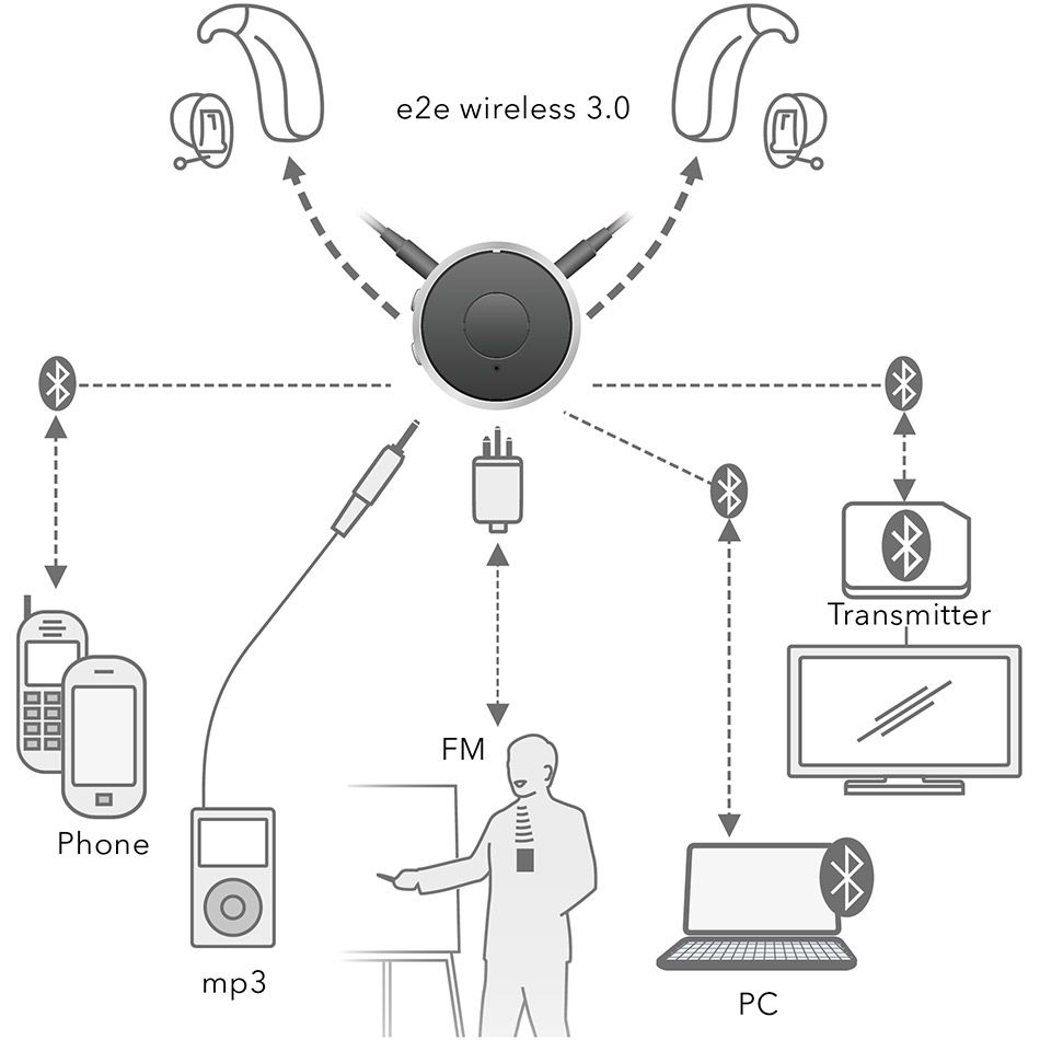 과거 아날로그 보청기와 달리 디지털 보청기에서 무선 기술의 적용은 음향을 재생하는 텔레비젼, 오디오, 스마트폰 등의 가전제품 같은 외부 기기 연동 기술과 양이 착용에서 두 보청기의 무선 연결로 나눌 수 있습니다. 최근 각광을 받고 있는 블루투스(bluetooth)는 보청기를 통해 다양한 기기의 음향을 들을 수 있습니다. 각 보청기 제조사에서는 중계기(gateway device)를 사용한 제품을 소개하고 있습니다. 중계기는 블루투스를 포함한 주변 기기들로부터 보청기 대신 신호를 받아 전력 소모가 보다 적은 텔레코일(telecoil)이나 무선 주파수(radio frequency, RF) 기술을 통하여 보청기로 전송할수 있게 하는 중계장치를 말합니다. 현제 많은 디지털 보청기 무선 기술은 RF통신과 결합된 근거리 자기유도 기술(NFMI)을 사용하고 있습니다.