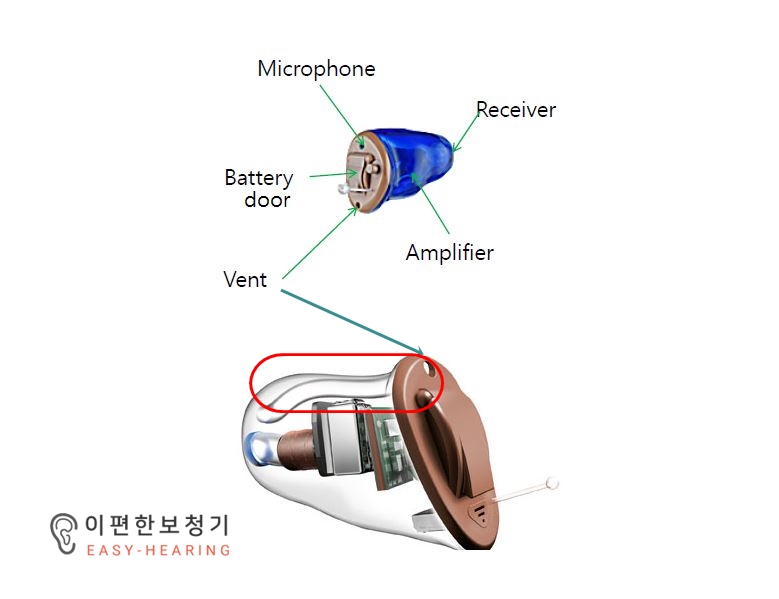 [그림] 보청기 환기구(=벤트)의 타입 : 수평형(좌)과 대각형(우)