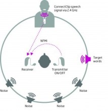 ※ 그림설명 : 테스트설정은 두가지 조건에서 수신기 뒤에 있는 4개의 스피커로 부터 발생하는 ICRA음성과 유사한 노이즈로 구성. 즉, ConnectClip 마이크를 사용하여 표시되는 1분 뉴스 세그먼트와 수신기의 귀 쪽에서 나오는 대상단어가 그것이다.