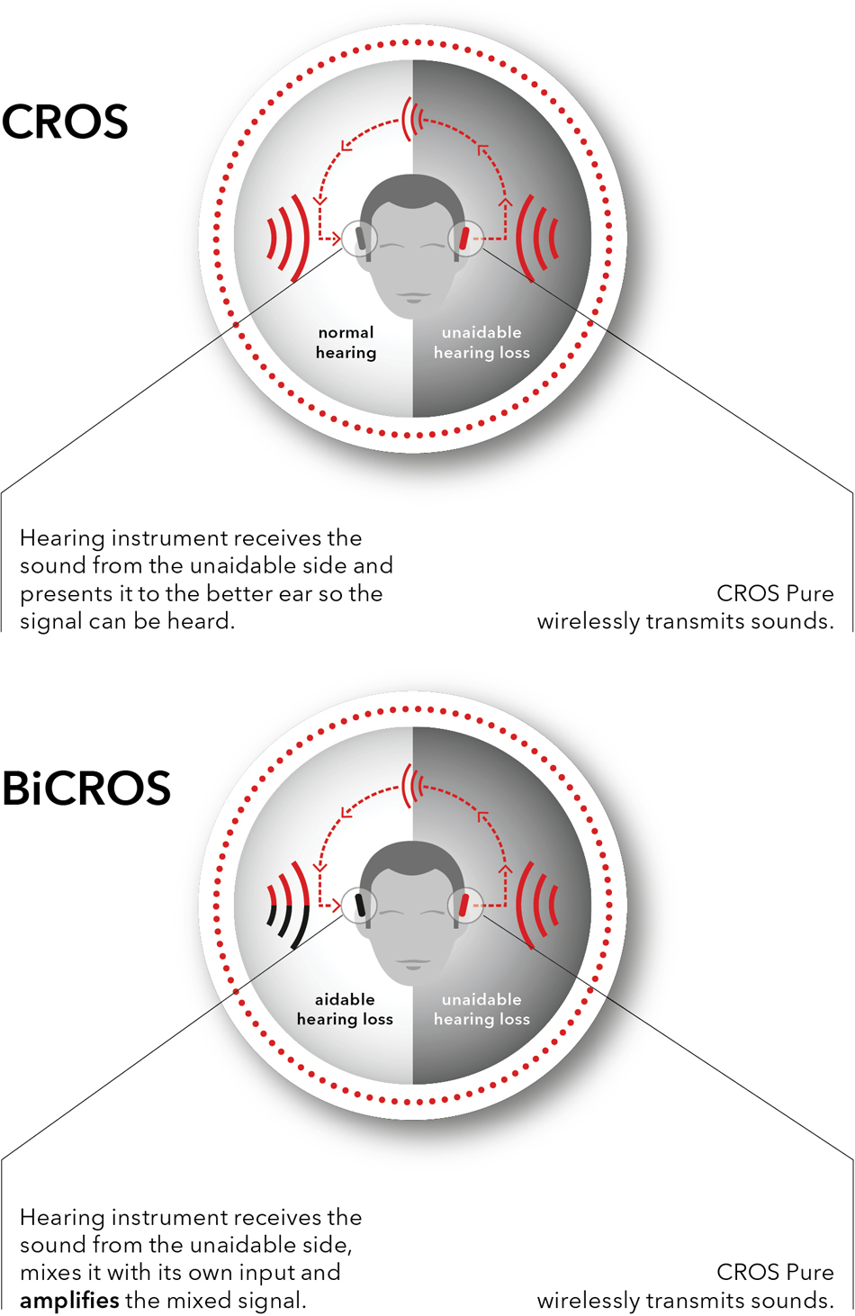 오티콘 CROS솔루션은 청력이 좋지 않은 귀에 설치된 송신기로 구성되어 있으며, 이 송신기는 근거리 자기장 유도(NFMI)를 통해 수신 및 호환 가능한 오티콘 보청기에 신호를 보냅니다. 상단의 그림은 두가지 시나리오를 보여 줍니다. 더 나은 귀은 정상적인 청력(CROS피팅) 또는 청각 장애(BiCROS피팅) 일 수 있습니다. CROS송신기는 OticonOpnS보청기와 유사한 고급 신호 처리를 수행하는 데 필요한 기능을 갖춘 miniRITE T 스타일 보청기입니다. 소음 억제 알고리즘 내에서 OpenSoundNavigator(OSN)에는 네가지 도움말 수준(낮음, 중간, 높음, 매우 높음)과 단순하고 복잡한 음향 환경에서 사용할 수 있는 다양한 수준의 소음 제거 기능이 있습니다.
