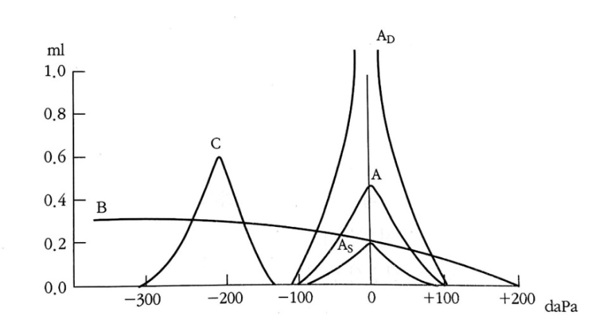 • A형(type) : 정상 또는 감각신경성 난청에서 나타나는 형태로 중이강이 공기로 차 있고, 중이 내 압력도 정상임을 나타냄