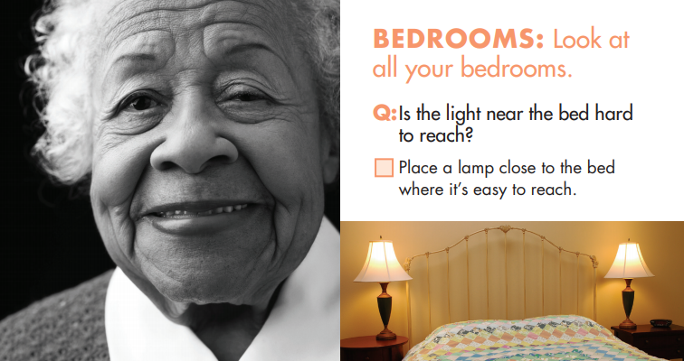 적절한 조명을 확보하면 보다 안정적인 시각적 정보를 제공할 수 있습니다. 적절한 조명이 특히 중요한 지역에는 침대 옆에 있는 램프, 계단이나 집 안의 울퉁불퉁한 땅, 그리고 화장실과 복도의 야간 조명이 포함 됩니다.