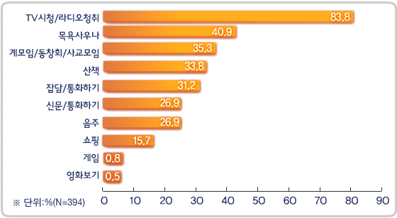 노인인구가 증가하면서 노인들의 여가문제가 새로운 화두로 대두되고 있습니다. 경제적 여건이 충분치 못한 노인층은 여행, 운동, 취미생활 등에 충분한 투자가 어려워 많은 여가시간을 TV시청에 할애합니다.