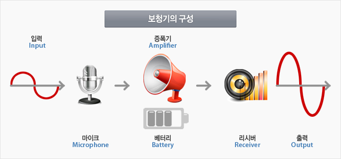 이러한 노인성 난청은 한 번 시작되면 되돌리기가 불가능합니다. 따라서 노인성 난청이 진행됐다면 보청기를 사용하는 것이 가장 좋은 방법입니다.  보청기는 일반적으로 음향적 신호(소리)를 전기적 신호로 변환시키는 송화기(Microphone), 보청기의 핵심으로 전기적 신호를 증폭시키는 증폭기(Amplifier), 전기적 신호를 다시 음향적 신호(소리)로 변환시키는 수화기(Receiver), 신호(소리)의 크기를 조절해 주는 조절장치(Controls), 전체 시스템에 전기를 공급하는 전원(Bettery)으로 이루어 집니다.