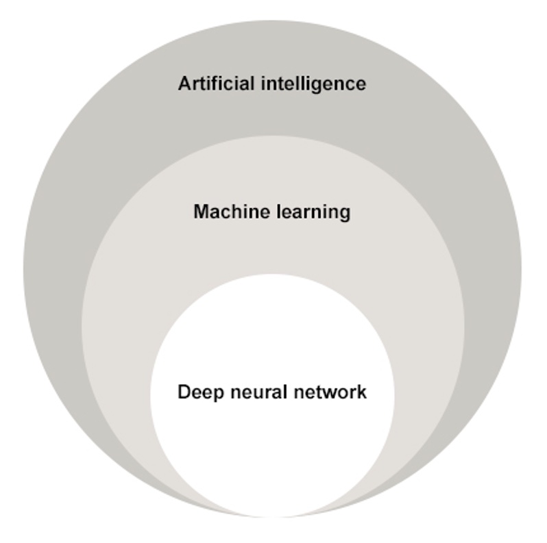 "인공 지능"(AI), "머신 러닝"(ML) 및 "심층 신경망"(DNN)이라는 용어는 모호하고 상호 호환성이 있어 보일 수 있습니다. 그러나 우리가 가장 정교하고 진보된 프로토콜인 DNN에 도달할 때까지 다소 포괄적 인 용어 인 “AI” 에서 “ML”로 이동하면서 계산 분석, 의사 결정 및 정교함의 수준이 증가하게 됩니다 (그림 1).