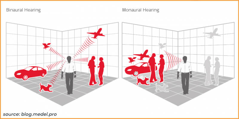 두 개의 귀를 사용하면 양방향의 소리를 선명하게 들을 수 있습니다. 신체의 한쪽에서만 소리를 듣는 것은 다른 쪽에서 명확하게 들을 수 있는 소리의 양을 제한합니다. 이것은 소음을 이해하고 이해할 수 있는 범위를 제한합니다.