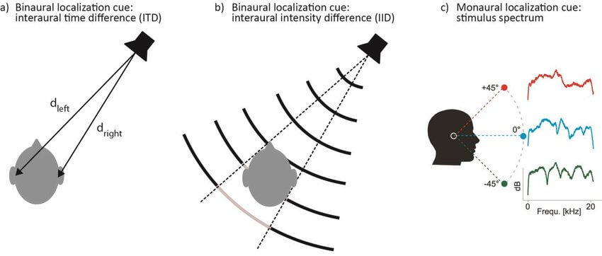 [그림설명] 사운드 위치파악에 사용되는 바이노럴 및 모노럴 큐(양측 및 편측 단서) - a)정중선을 벗어난 음원의 경우 귀에 도달하기 전에 소리가 이동한 거리는 왼쪽 귀(d left)와 오른쪽 귀(d right)로 표시됨. 그 결과 방위각 음원 위치에 대한 바이노럴 큐를 나타내는 ITD(이간 차이)가 발생함. b) 음파에 대한 헤드섀도잉(머리가림효과, 두영효과)은 방위각 음원위치에 대한 바이노럴 신호를 나타내는 이간 강도차이(IID)을 초래함. c) 음파와 귀, 머리 및 몸통의 상호작용으로 인해 음원 위치의 고도에 따라 고막에 도달하는 자극 스펙트럼