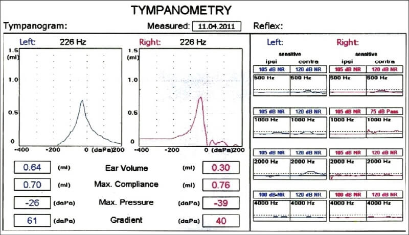 고실도가 정상 범위 내에 있으면 고막이 자극에 대한 반응으로 움직일 때 선이 약 0 daPA의 "산" 모양을 만듭니다. 결과는 오른쪽 그림에 나와 있습니다. 고실도가 비정상인 경우 0 daPa 표시 전후에 최고조에 달할 수 있으며, 고막이 움직이지 않거나(천공으로 인해) 움직일 수 없는 경우(액체 또는 다른 원인으로 인해) 평평한 선이 그려집니다. daPa는 기압의 단위인 데카파스칼을 나타냅니다.