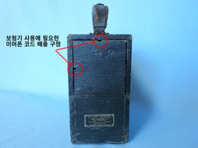 [그림8] Vactuphone의 오른쪽 끝은 전자 장치 구획(상단 절반)과 명판(하단)에 접근할 수 있는 숨겨진 트랩 도어를 보여줍니다. 트랩 도어의 상단 중앙과 왼쪽 중앙에 있는 두 개의 반원형 구멍에 주목하십시오. 이 보청기를 사용할 때 이어폰 코드가 빠져나오기 위한 것이었습니다.