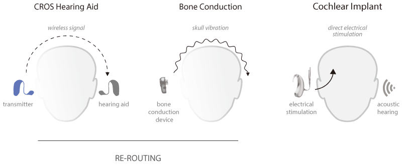 CROS 보청기 시스템은 한쪽 귀는 거의 완전한 난청이지만 다른 쪽 귀는 정상 청력을 가진 사람들을 위해 설계되었습니다. CROS는 난청에서 발생하는 소리를 감지하여 좋은 귀로 전달합니다. 이를 위해서는 양쪽 귀에 장치를 착용해야 합니다. 기능이 없는 귀에 사람이 송신기 장치를 착용하고 기능적인 귀에 사람이 소리를 처리하고 마이크를 통해 전달하는 수신기를 착용합니다. 이 소리는 상대적으로 정상적인 청력을 가지고 있기 때문에 정상 이상으로 증폭되지 않습니다.