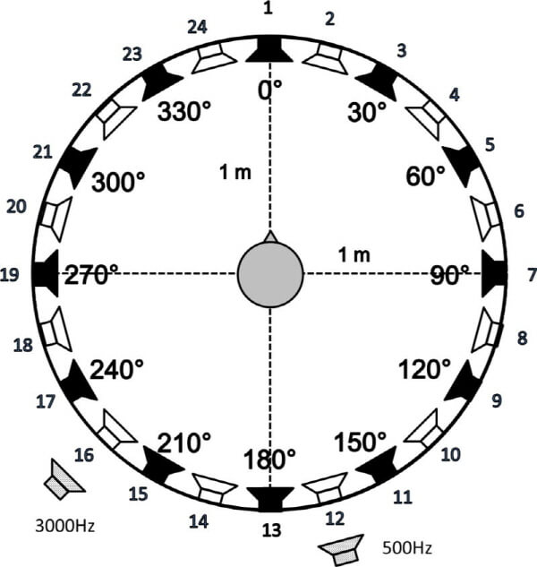 [그림1] 실험실 위치 파악 테스트용 스피커 배열. 24개의 스피커가 15도 간격으로 배치. 홀수 스피커(12개)만 활성화됨. 소음 테스트와 위치파악을 위해 500Hz 및 3,000Hz의 협대역 소음을 표시하기 위해 원 외부에 추가 스피커를 배치함,